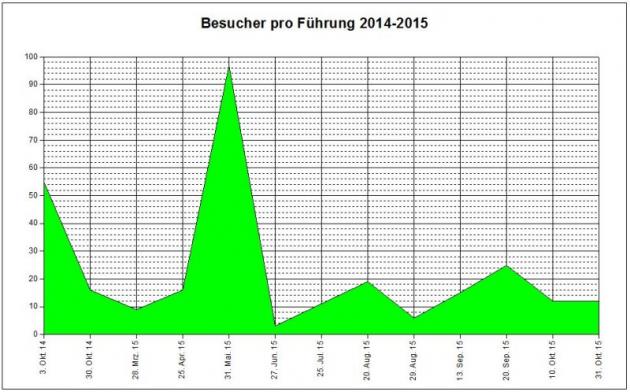 296 Besucher kamen von Oktober 2014 bis Dezember 2015 zu den 13 öffentlichen Führungen des Vereins. Obwohl die Zufahrt zum historischen Ort bisher nicht ausgeschildert ist, fanden durchschnittlich 23 Besucher pro Führung den Weg nach Schwedt.