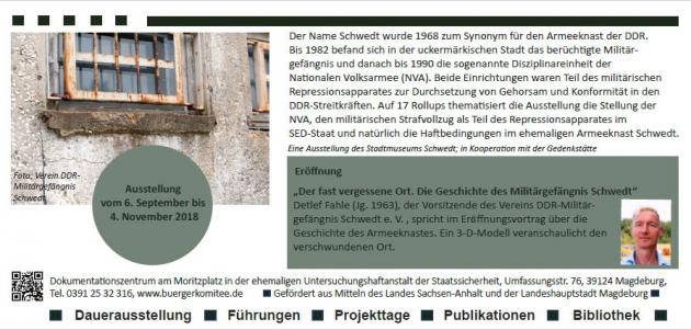 Vom 06. September bis 04. November 2018 wird die Wanderausstellung „NVA-Soldaten hinter Gittern. Der Armeeknast Schwedt“ in Magdeburg gezeigt.